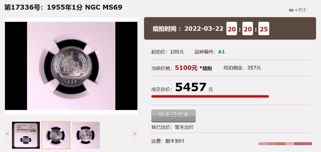 分币四小龙,是指55年的1分、57年的1分、92年的1分、2分。根据最新成交价,55年1分,NGC69分,5457元。