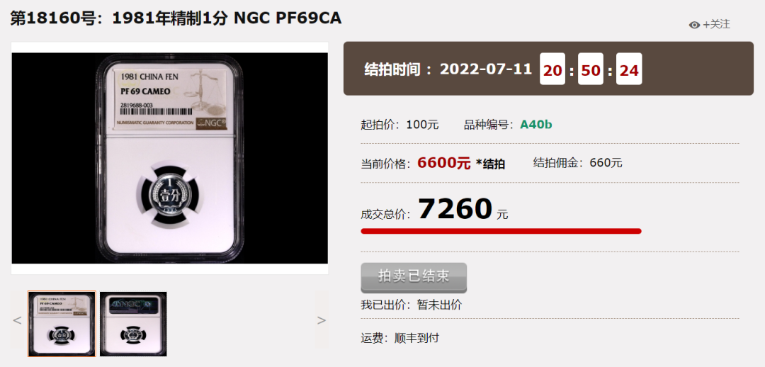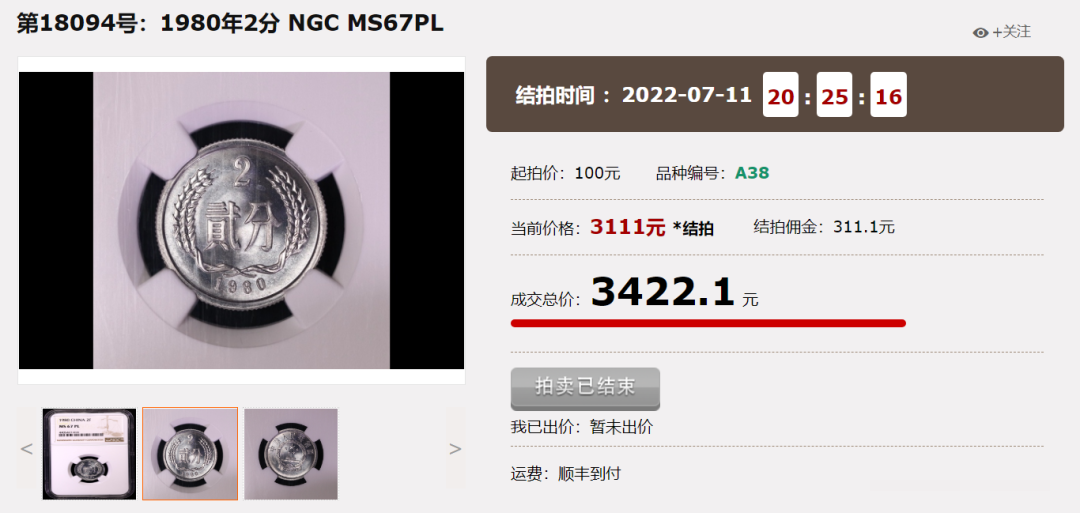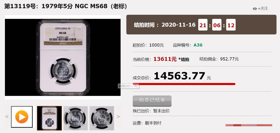 所谓分币五大天王,就是指79年的5分、80年的2分、5分、81年的1分、5分,每一枚都价值不菲。最新的拍卖成交价,1979年5分,NGC68分,14563元。