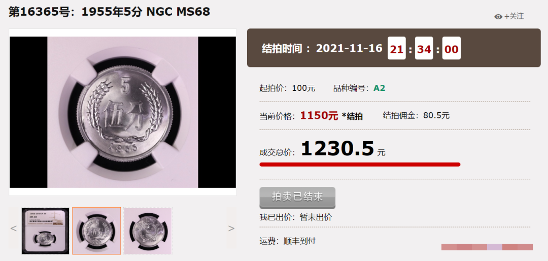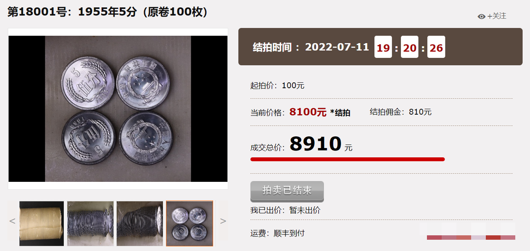 今年7月11日,一卷1955年的5分硬币上拍,最终以8910元成交,平均每枚89.1元。