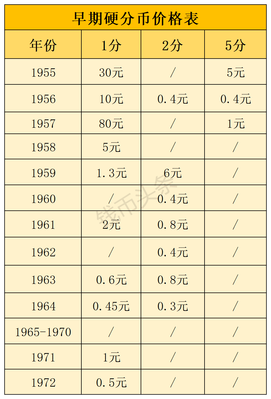 但是大家手里有的基本都是流通品相,价格便宜一些,小钱整理了1955~1972年分币价格表,仅供大家参考。