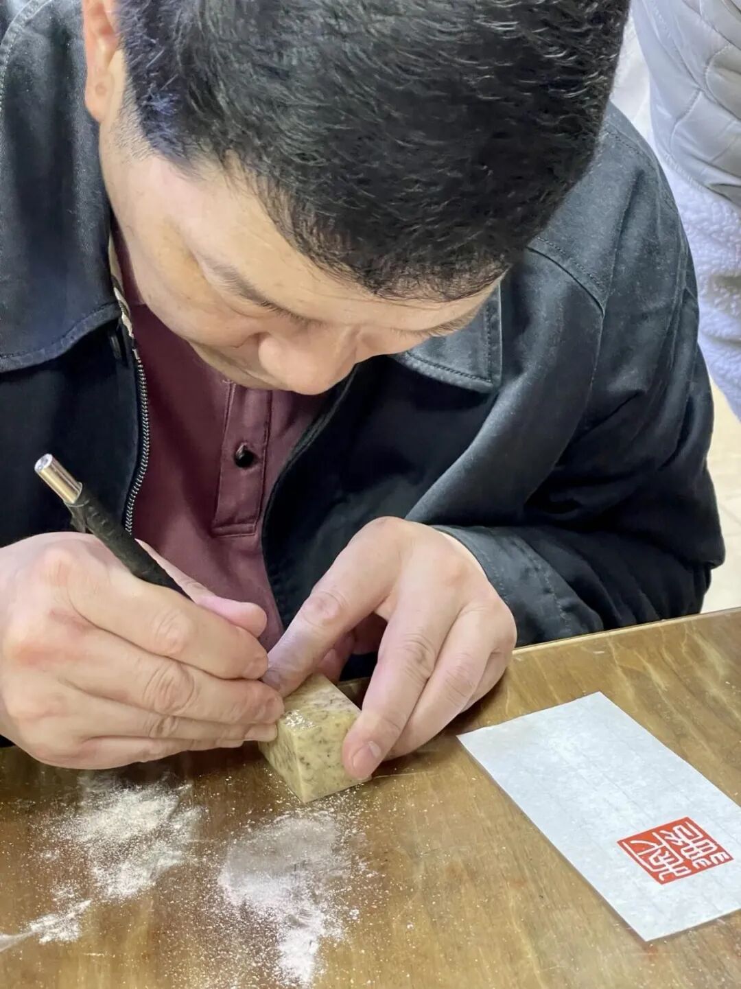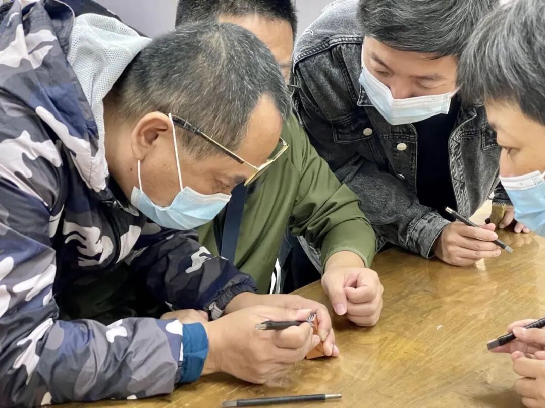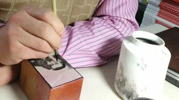 手执治印专用刻刀,需稳健、有力,初学者宜尽可能以标准的手势练习用刀。
