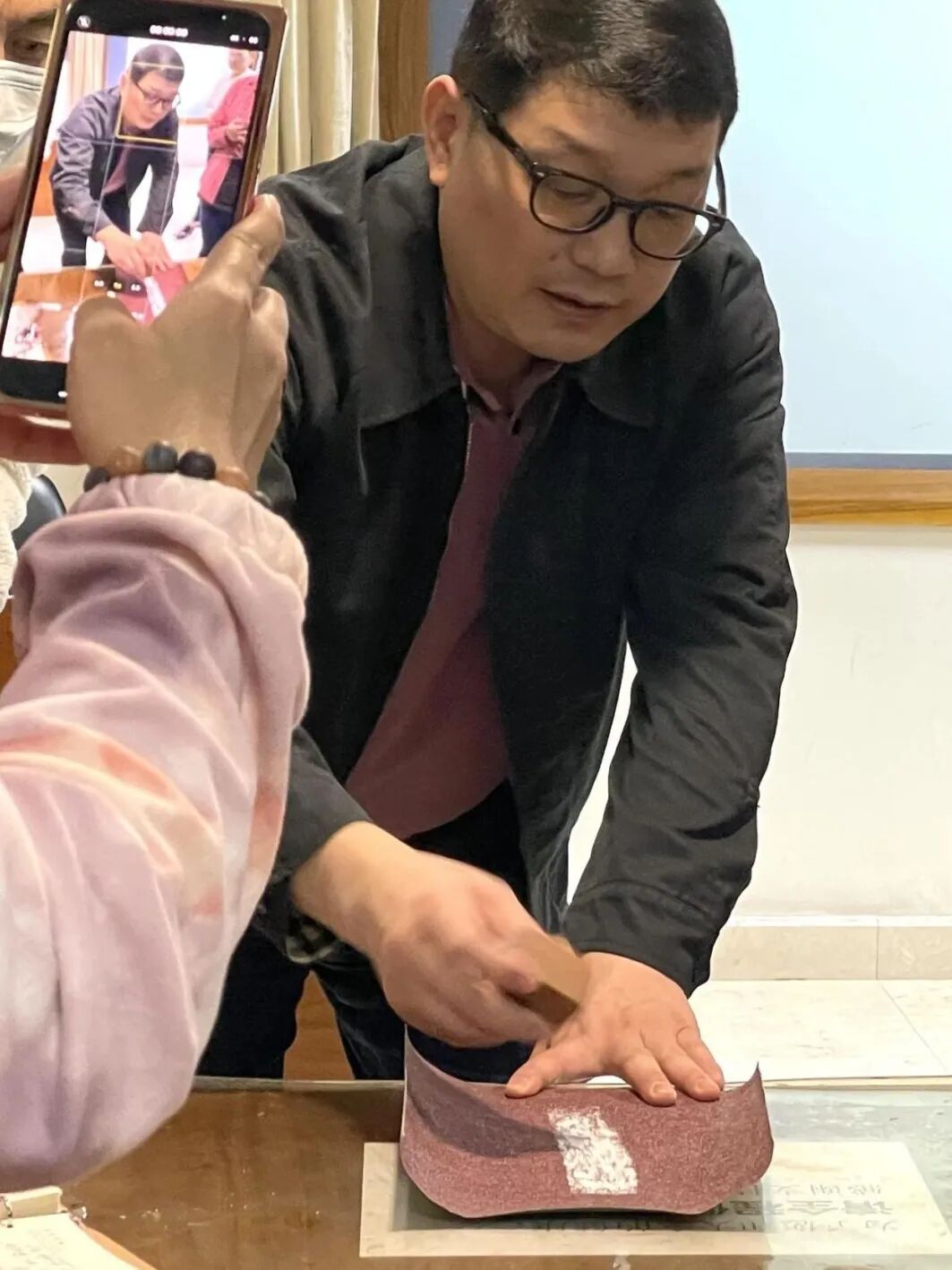 将代刻的文字或图形水印上石或直接书写于印面,力求笔画清晰精准。