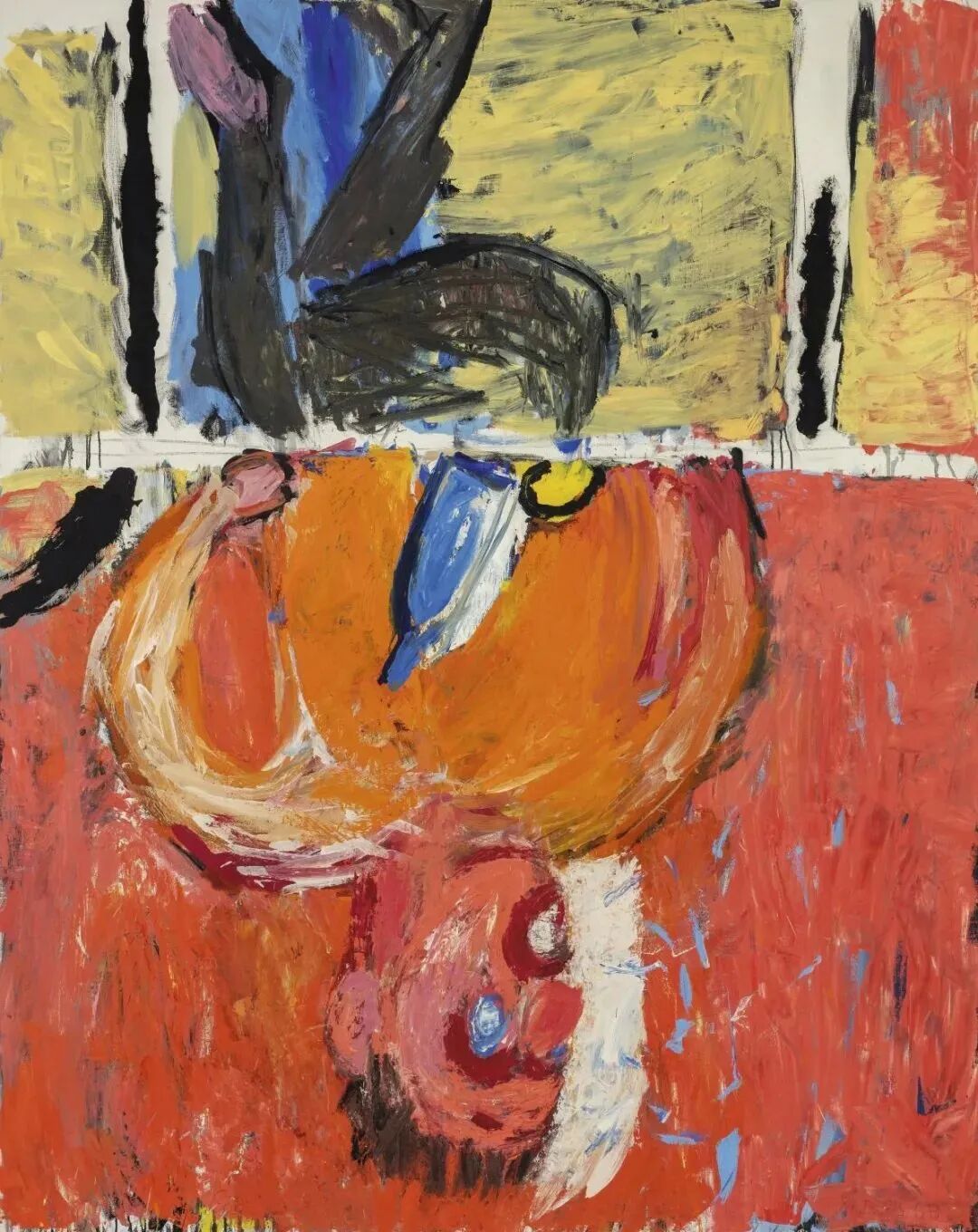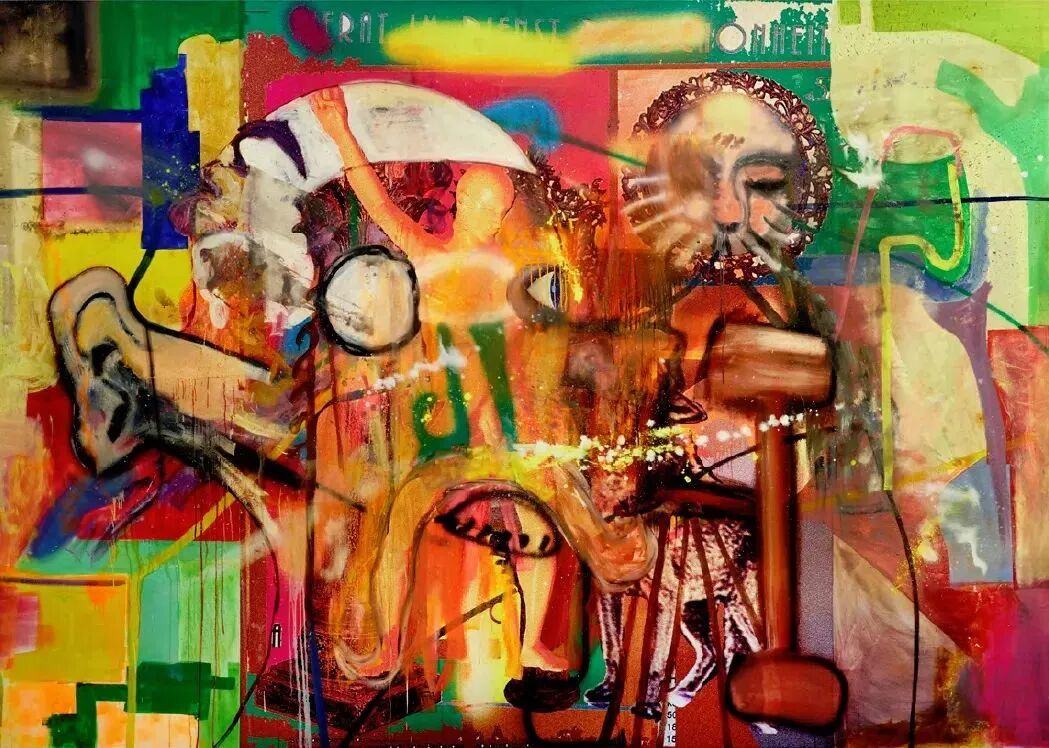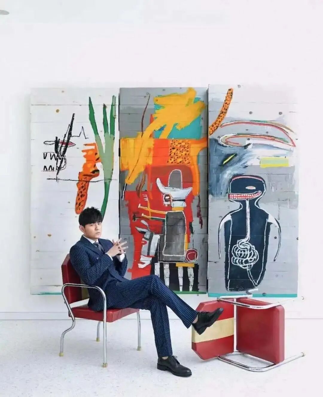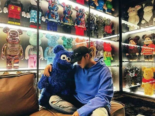 要说周杰伦最喜爱的艺术家,非巴斯奎特莫属,他被誉为“黑人毕加索”。这幅巴斯奎特的《无题(橘色运动人像)》价格不菲,是周杰伦以7322万港元在佳士得香港2018年春季拍卖会上购得。除了这些,还有三幅艺术作品被放进《不爱我就拉倒》的 MV中,均是周杰伦在2018年的香港巴塞尔上收藏回来的。其中两幅是德国艺术家里希特的作品,一幅是《抽象画800-7》,另一幅是《抽象画776-1》。第三幅是来自美国艺术家极简主义先驱弗兰克斯特拉的画作《Mary Lou Loves Frank》。弗兰克斯特拉《Mary Lou Loves Frank》在2020年,周杰伦还带着两幅他收藏的艺术品登上了Elle杂志。一幅是格奥尔格巴泽利茨的《餐桌上的饮酒者》,另一幅是阿尔伯特厄伦的《在镜子的一端》。周杰伦说,“收藏件数并不重要,重要的是收藏到我认为最‘屌’的作品,而且要有丰富的文化价值和意义。我大部分的收藏都是当代艺术作品,还有一些是限量版的艺术衍生品。我理解的当代艺术,不是一定要知道画面究竟在表达什么,当代艺术给我的感觉就像是,我不认为这个世界有一个很确定的、单一的观点,任何事物都没有唯一或标准的答案”。所以他觉得这两幅作品非常“屌”。《餐桌上的饮酒者》画的是一个倒置的人,这让他想起他的一首歌《反方向的钟》,希望时钟能够穿梭画面,朝着反方向移动。《在镜子的一端》的感觉就像是他的一首歌《逆鳞》里唱的,“只能扑向泥泞,迎向那阵骤雨由不得你”。在周杰伦的家中还摆放了很多潮流艺术品。他本人就是积木熊的忠实粉丝,他在社交网站晒出的全家福周围摆放的全是限量款积木熊,价格高达百万元。KAWS也是周杰伦非常欣赏的潮流艺术家,周杰伦曾晒出妈妈叶惠美与宠物狗的合影,背后就是KAWS的海绵宝宝画作。周杰伦相信艺术是无界限的,他鼓励每个年轻人能欣赏原创作品,去感受每一件艺术作品背后来自创作者的诚意,因为每一件作品都有一个不一样的故事,学会欣赏是建立你和艺术之间联系的第一步。