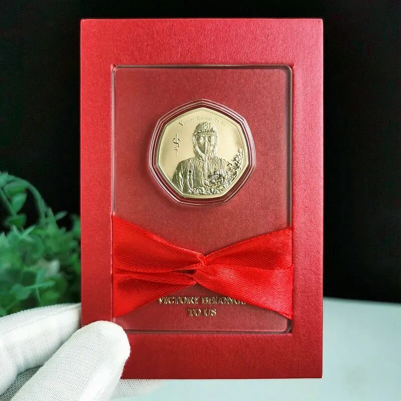 除此之外,这枚币的包装也非常精美。采用经典卡册包装,正面是红丝带组成的蝴蝶结造型,像是一张贺卡,祝贺大家抗疫胜利。