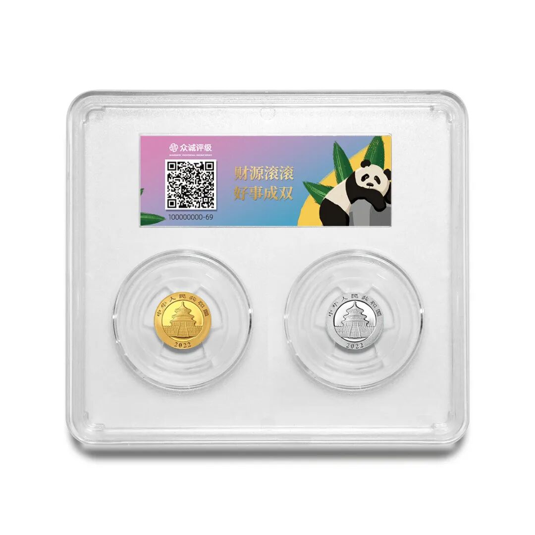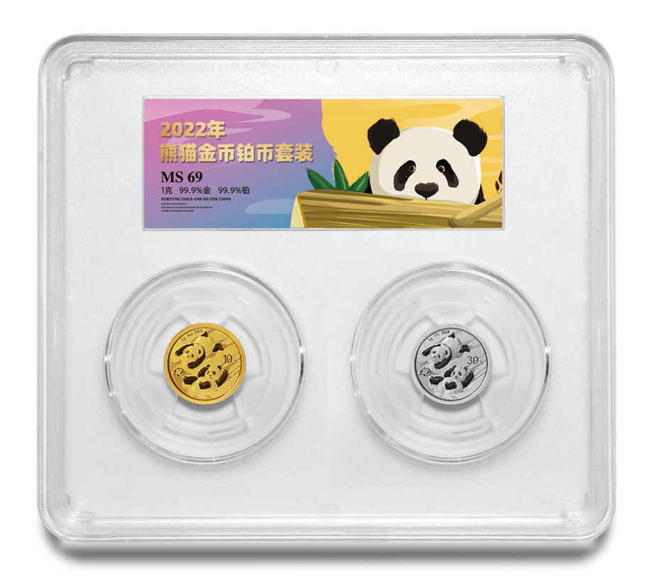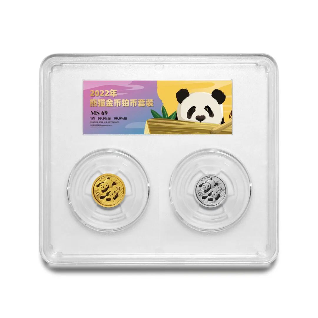 这套币,选取了2022年的1克熊猫金币和1克熊猫铂币进行组合封装。