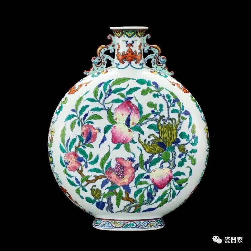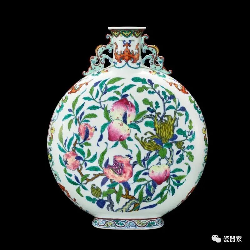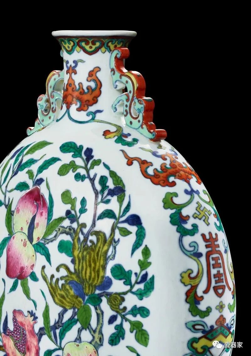 据录奉乾隆四年(1739年)御旨制成于五年(1740年)Lot 3505清乾隆 鬪彩加粉彩福寿三多双龙耳扁瓶耿宝昌,《明清瓷器鉴定:清代部分》,台北,1984年,图版165