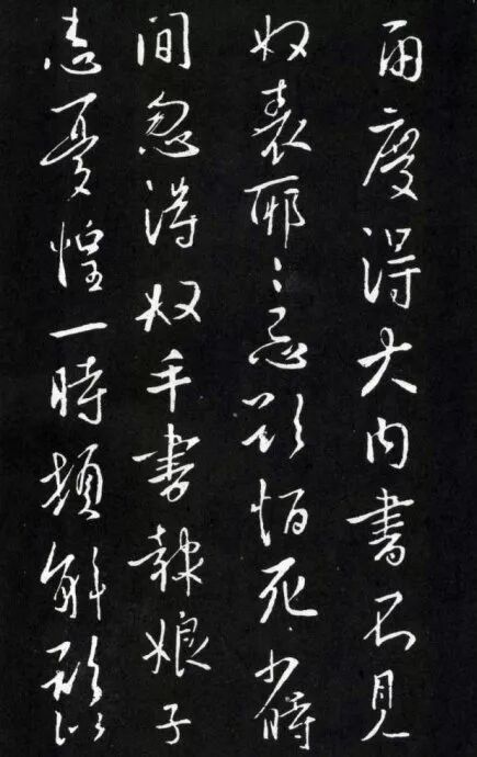 草书发展到唐代,在东晋“今草”基础上又有飞跃发展。草书的字形进一步被打开,草书中汉字的实用信息传递功能进一步被消减,书法的抒情性得到进一步加强。一种与音乐相类似的通过汉字书写表现情感的纯艺术——“狂草”由此诞生。推动草书艺术走峰巅的,正是中国书法史上的奇人——大书法家张旭。唐代大文豪韩愈曾描述曰:“往日张旭善草书,不治他技。喜怒窘穷,忧悲、愉夫、怨恨、思慕、酣醉、无聊、不平,有动于心,必于草书焉发之。观于物,见山水崖谷,鸟兽虫鱼,草木之花实,日月列星,风雨水火,雷霆霹雳,歌舞战斗,天地事物之变,可喜可愕,一寓于书。故旭之书,变动犹鬼神,不可端倪。以此终其身而名后世。”唐人好以书饰壁,相传张旭经常是狂饮大醉,然后举笔“呼叫狂走,乃下笔”。甚至疯狂地“以头濡墨而书”,“既醒自视以为神,不可复得也”。因此他在历史上得了一个外号“张颠”。张旭的草书纵横奔放,气势凌厉,一如李白的诗,弥漫着一股盛唐时代特有的浪漫气息。这里凝聚着他一生的悲欢,也融铸着他一生的愤懑忧郁。时人以李白之诗、裴旻之剑、长史之草书为盛唐“三绝”。