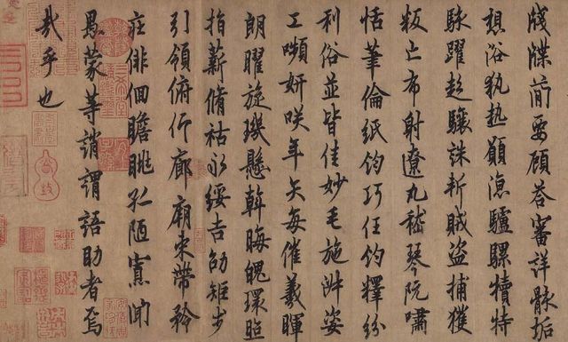 在“宋四家”中,米芾可以说是一个比较纯粹学者艺术家。在学术研究、书画创作、书画鉴定、收藏等领域,都取得了很高的成就。在学术方面,他有《书史》、《海岳名言》、《宝章待访录》等着作传世,是书法研究的专业必读书。在鉴赏方面,历史上有不少名帖,都经他鉴定题跋。他的画,在历史上有着名的“米点”、“米家山水”,是中国山水画法的一种样式。至于他的行书、草书都是出于“二王”,而变化生姿。他用笔非常灵活多变,自称“刷字”,正侧、偃仰、向背、转折、顿挫,八面出锋,用笔沉着痛快,气势超迈飘逸,笔势跳跃,点线俊美,神气完足,把“二王”行草书写出了一种新境界,是书法史上受到追多追捧、粉丝最多的书法家。米芾在书法上的成就,得力于他长期对经典的忠实研究。他曾说:自己是“壮年未能成家,人谓吾书为‘集古字’,盖取诸长处,总而成之。既老始自成家,人见之,不知以何为祖也。” 他对自己书法相当自负。《宋史》载:“米元章初见徽宗,命书《周官》篇于御屏。书毕,掷笔于地,大言曰:一洗二王恶札,照耀皇宋万古。”