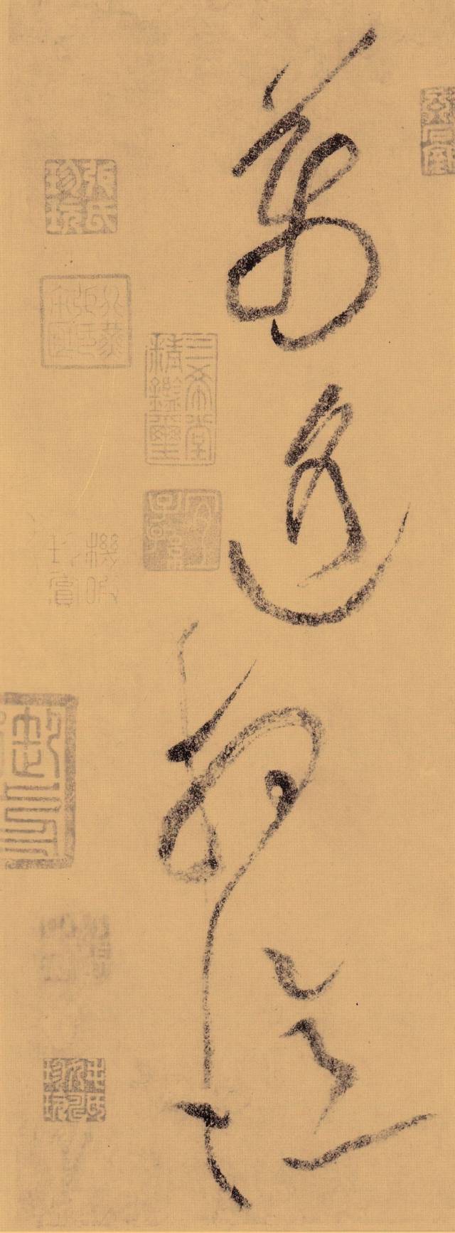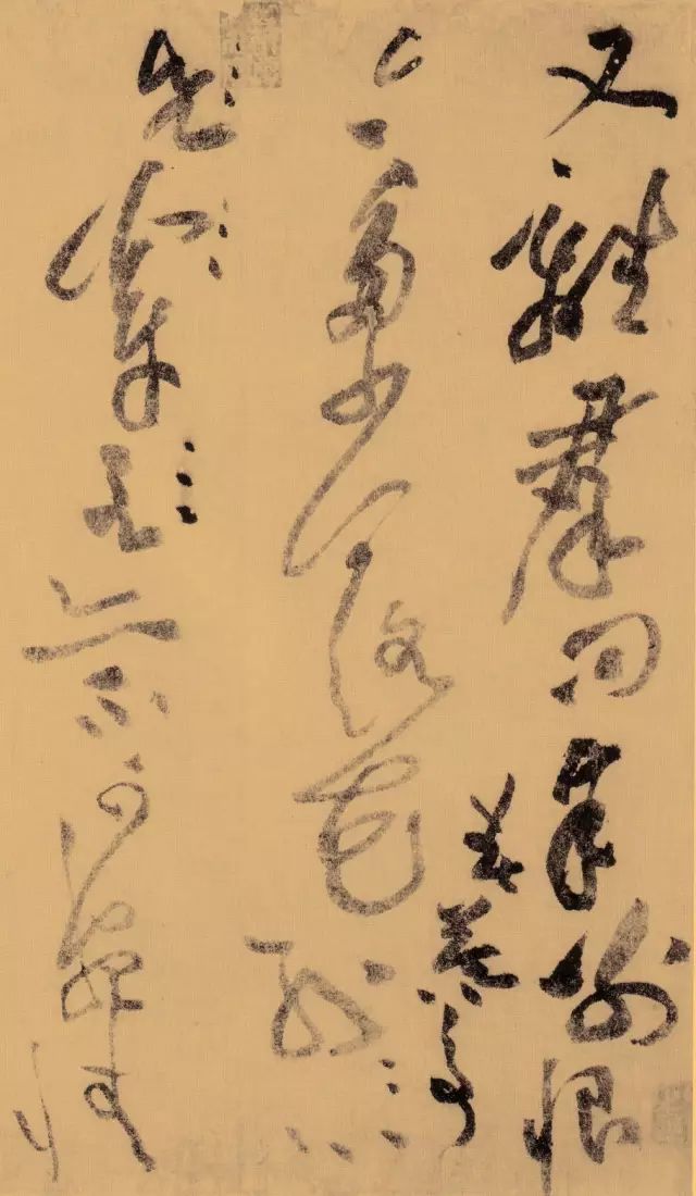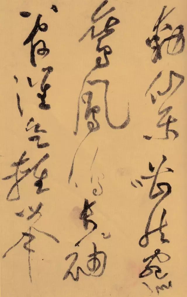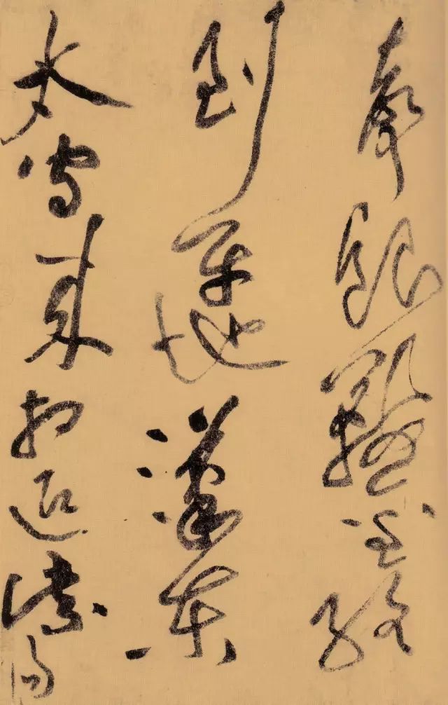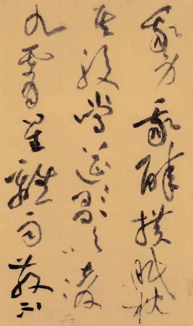 此卷将怀素瘦韧疾速的用笔,变得瘦硬而起伏多变,并将《怀素自叙》上下腾挪开合的行气章法,变得更为紧凑绵密,让布白空间呈现更多,左右摇曳的疏密对比,构成满纸云烟,飞花乱坠的意象。此卷多用“一笔书”,许多整行皆不换笔,卷舒多姿,把李白诗中惯有的豪迈机变空灵欲仙的意境作了倾情演绎。苏东坡讲“不践古人”,与黄庭坚所谓“方近古人”的宗旨是一致的,即非形似古人,而是对古人艺术的精神会合。黄庭坚得见《自叙》后所作草书一变,并非是苏舜钦等人亦步亦趋的描摹怀素,而是“自成一家”的自家面目。【3】{+风}声。银鞍金络到平地,汉东太守来相迎。紫阳【7】我身,我醉横眠枕其股。当筵歌吹凌九霄,星离雨散不【8】终朝,分飞楚关山水遥。余既还山寻故巢,君亦归家渡渭【9】桥。君家严君勇貔虎,作尹并州遏戎虏。五月相呼【10】凌太行,摧轮不道羊肠苦。行来北京岁月深,感【11】君贵义轻黄金。琼杯绮食青玉案,使我醉饱无归 关注公众号:古玉虫【12】心。时时出向城西曲,晋祠流水如碧玉。浮舟弄水箫鼓鸣,微【14】过,其若杨花似雪何。红妆欲醉宜斜日,百尺清潭写翠娥。翠娥婵{图片待补:娟初月辉,美人更唱舞罗衣。清风吹歌入空去,歌曲自绕行云飞。此时行乐难再遇,西游因献长杨赋。北}【15】阙青云不可期,东山白首还归去。渭桥南头一遇君,酂台之北【16】又离群。问余别恨知多少,落花春暮争纷纷。心{-?}{-?}{-?}亦不可尽,情