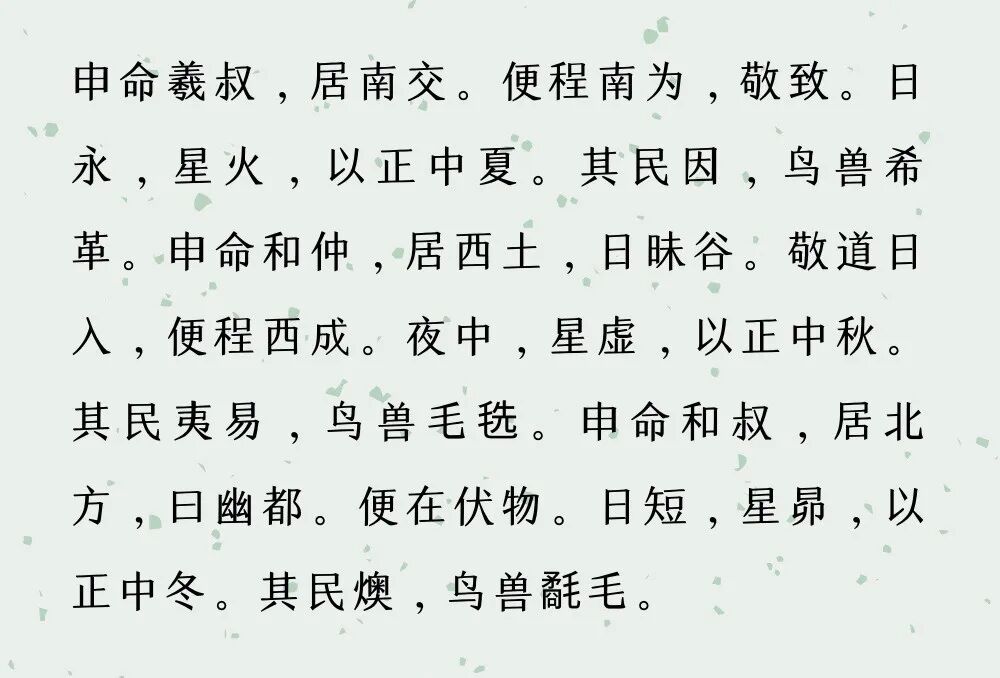 接着又讲他的父亲、继母、弟弟如何想要谋害他。这些内容,司马迁基本依据的是《孟子·万章上》。除此以外,关于尧、舜的内容,司马迁别有所本的,只有在位年数等,其余大多数内容都是根据《尧典》而来。那么,接下来的一个问题就是:《尧典》究竟是一篇什么样的书?它的历史价值如何?对此学术界有很大的争论,到今天都没有定论。我们只举几个例子。《五帝本纪》中提到的“敬授民时”这个概念,就是从《尧典》而来。《尧典》一开头,讲的就是有关天文历象的内容。“清初三大家”之一顾炎武就说,现在的人和古人不一样,三代以上人人都懂天文。《尧典》是当时人人必读之书,而不懂天文就不可能理解《尧典》,所以当时的人普遍都掌握了很多天文知识。中国自古以来逐渐进入农业社会,农业与四时运转有着极密切的关系。一直到今天,如果你到农村去,会发现很多农民或许在其他方面没有太多文化知识,但如果你跟他谈节气,他一定说得朗朗上口。所以天文学在中国,和在近东,如巴比伦一样,是最早兴起的一门科学。下面我们就来读一读《五帝本纪》中与“敬授民时”相关的内容。首先讲到尧是帝喾的后人:尧的名字叫放勳,后来成为帝尧。挚是先于尧继位的,死后他的弟弟尧继位。尧继位之后,各方面都做得很好:这是一个总的概括,形容他政治如何清明。在这样的情况下,他首先做的是:“敬授民时”是尧的德政中最主要的一条。他派羲、和到四个地方去观测天时。羲、和是四个人:羲仲、羲叔、和仲、和叔。他们观测天时的方法是在二分、二至的时候观察“昏中之星”。所谓“二分二至”,从现代科学的角度看,就是地球公转的四个点。“二分”就是春分和秋分,“二至”就是夏至和冬至,这些时间都是固定的,不会改变。这是在东方的一个观测点,具体在什么地点不去讨论了。“中春”就是指春分。这个时候日中的星是鸟宿,鸟宿是南方朱鸟七宿。“其民析”的“析”我们待会儿再讲。动物开始“字微”,就是求偶交合的意思。这就是所谓的“四中星”,这四个固定的星宿到了“昏中”,就确定了“二分二至”,换句话说,就确定了一年的四季。从古至今,有许许多多人在推算《尧典》“四中星”的观测年代。所得的结果不太一样,因为有几个问题大家看法不相同,比如说观测地点的问题。有人认为,所有的观测活动都是在尧都的位置。尧都传说是平阳,在山西的中南部。我们知道,由于地球的运转,天上的星象会随着时间推移而发生变化。如果拿《尧典》中的星象与今天来比,差别会很大。那么,《尧典》中说的究竟是什么时候的天象?目前最好的、以尧都中原地区为标准的推算结果是竺可桢先生得出的。他得出的结果是:四中星是在商末周初出现的,换句话说是在公元前十一二世纪。这个结论后来经过很多学者反复推算,当然推算的结果也会有一些前后出入,但基本上是认可竺可桢先生的观点的。不过,这个情况后来有所改变。1983年,天文史家赵庄愚先生发表了一篇论文,引起天文学界的重视。他认为应像《尧典》记载的那样,把人派到不同的地方去观察,而不是在首都一个地方观察。他定了四个点,用当地的经纬度计算,认为最可能的时间是公元前2060年。这个时间比较契合于我们所设想的尧舜时代。不论如何,《尧典》的“四中星”一定是从很古的时候传下来的,至于能古到什么时候,大家还可以继续讨论。不管怎么说,这一段关于“敬授民时”的内容影响非常大。这种由国家、中央颁发历法,确定农作时间的传统,在中国几千年的历史中一直传流了下来。明朝在北京的午门,至少一直到清初,每年都要举行一个典礼,就是在立春这一天,宛平县的县令(北京在明清时分为两个县,一个是大兴县,一个是宛平县)带着一些老农到午门前跪成一排,由太监系下一个镏金凤凰,凤凰嘴里叼着诏书,宛平县令跪接诏书并当众宣读。诏书上的话不是用文言文写的,而是大白话,因为它代表皇帝对老百姓说话。这几句话的大概意思是:今天到了立春了,大家该种地了,你们应该带着你们的子弟好好去种地。这个典礼是一种象征,它代表了中国自古以来的一个传统:朝廷不管有多高、有多深,它始终有一个责任,就是“敬授民时”,这个传统就是从《尧典》来的。所以,把《尧典》放在《尚书》的第一篇,也说明了这个问题。还有一个很好的证据可以说明《尧典》中包括了一些很古老的内容,这是20世纪40年代由甲骨学家胡厚宣先生发现的。他在40年代所著的一篇文章中介绍了几片甲骨,其中最重要的就是这一片:在看这片甲骨之前,我们先来读一下《五帝本纪》中的这几句话:这是什么意思?大家看“三家注”就能知道,这主要和一年四季东南西北的农事有关。“析”的意思是一家子人都分开了,大家都去种地了;“因”的意思是大家集合起来,一起进行农事;“夷”和“易”都是平的意思,庄稼收获了,把地都铲平了;“燠”是藏的意思,大家都藏起来了。有关这几个字的解释还有很多种不同的说法,但基本上,这段话讲的就是春生夏长,秋收冬藏,用这样一个农事的循环来代表四季。现在我们来看这片甲骨。它是一片牛肩胛骨,属于商朝的武丁时期。奇怪的是它不是占卜的卜辞,上面刻着四段话:“东方曰析,风曰协;南方曰因,风曰凯;西方曰韦,风曰彝(根据其他甲骨文来看,这里的西方一句,把风