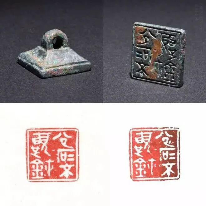 长 2cm 宽 2cm 高 1.3cm 重 21.2g铜质,鼻钮,文字为战国齐系风格,质地优良,铸造精美,文字完整,布局巧妙,字法独特,与流失东瀛一枚古鉨同文。该流失日本的鉨印曾多处著录,但从未见原器物图片,不敢断其真伪。此件原器物为清末收藏大家李嘉福所藏,曾著录于《陈簠斋手拓古印集》和《印典》。