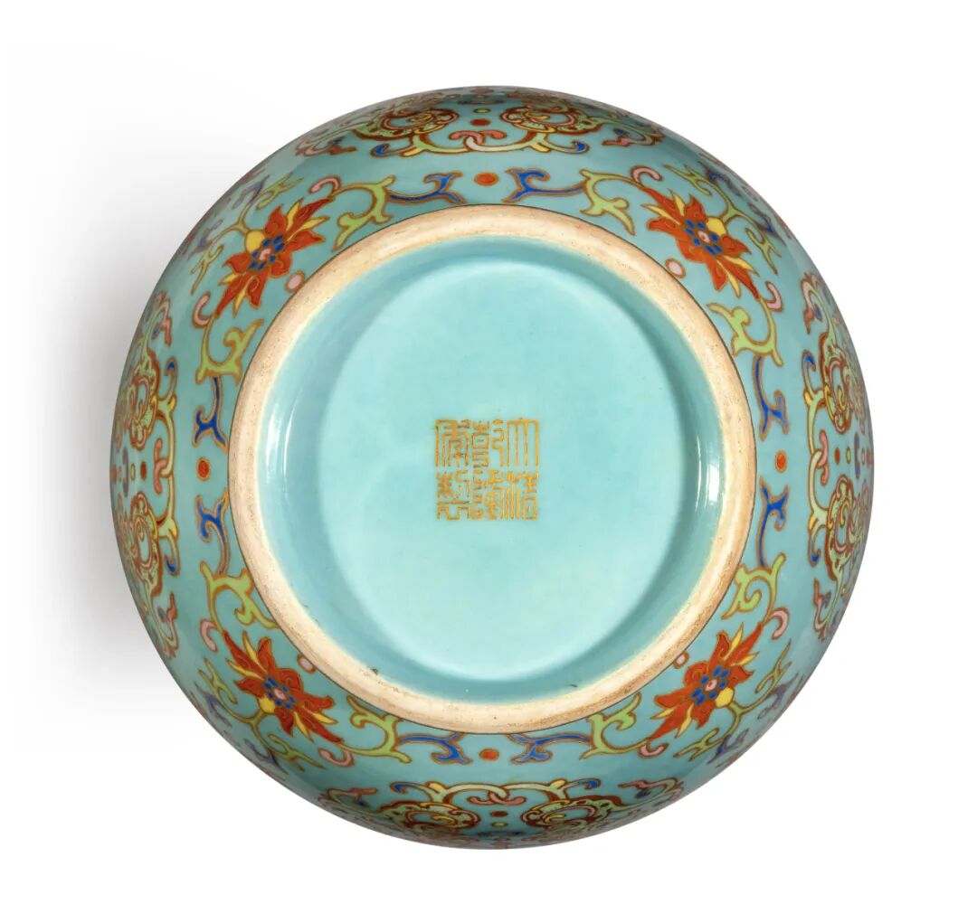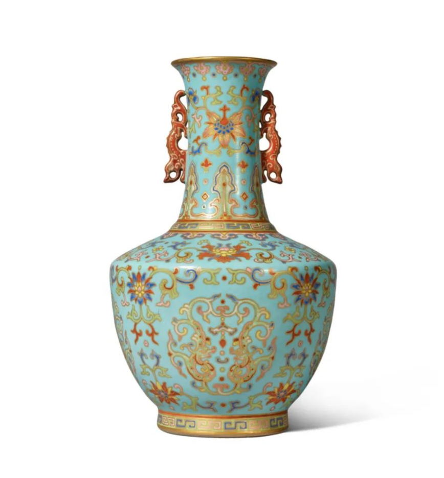 瓷胎仿掐丝珐琅器之典例清乾隆松石绿地粉彩描团龙吉庆纹螭耳瓶则以约34万美元成交。