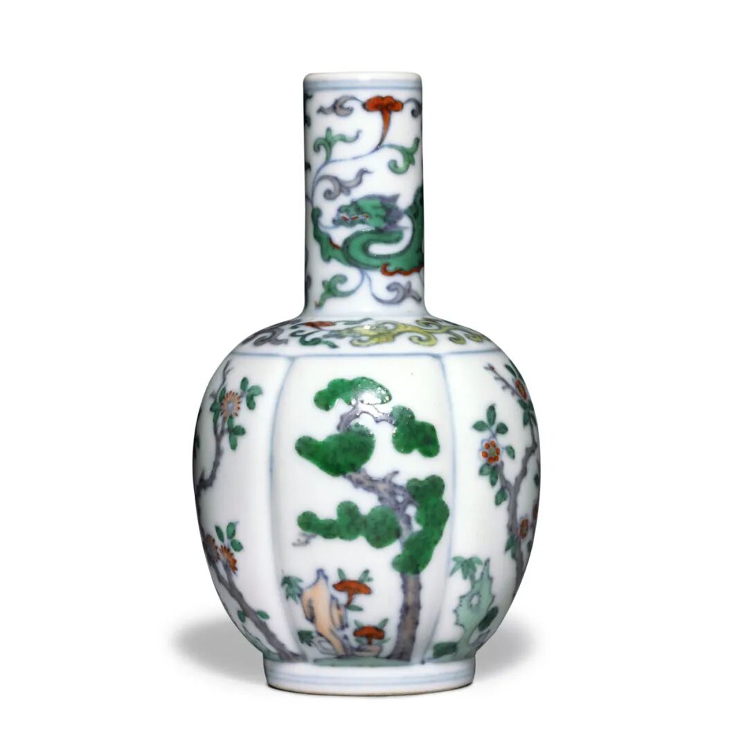 清雍正斗彩岁寒三友花卉螭龙纹瓜棱式小瓶