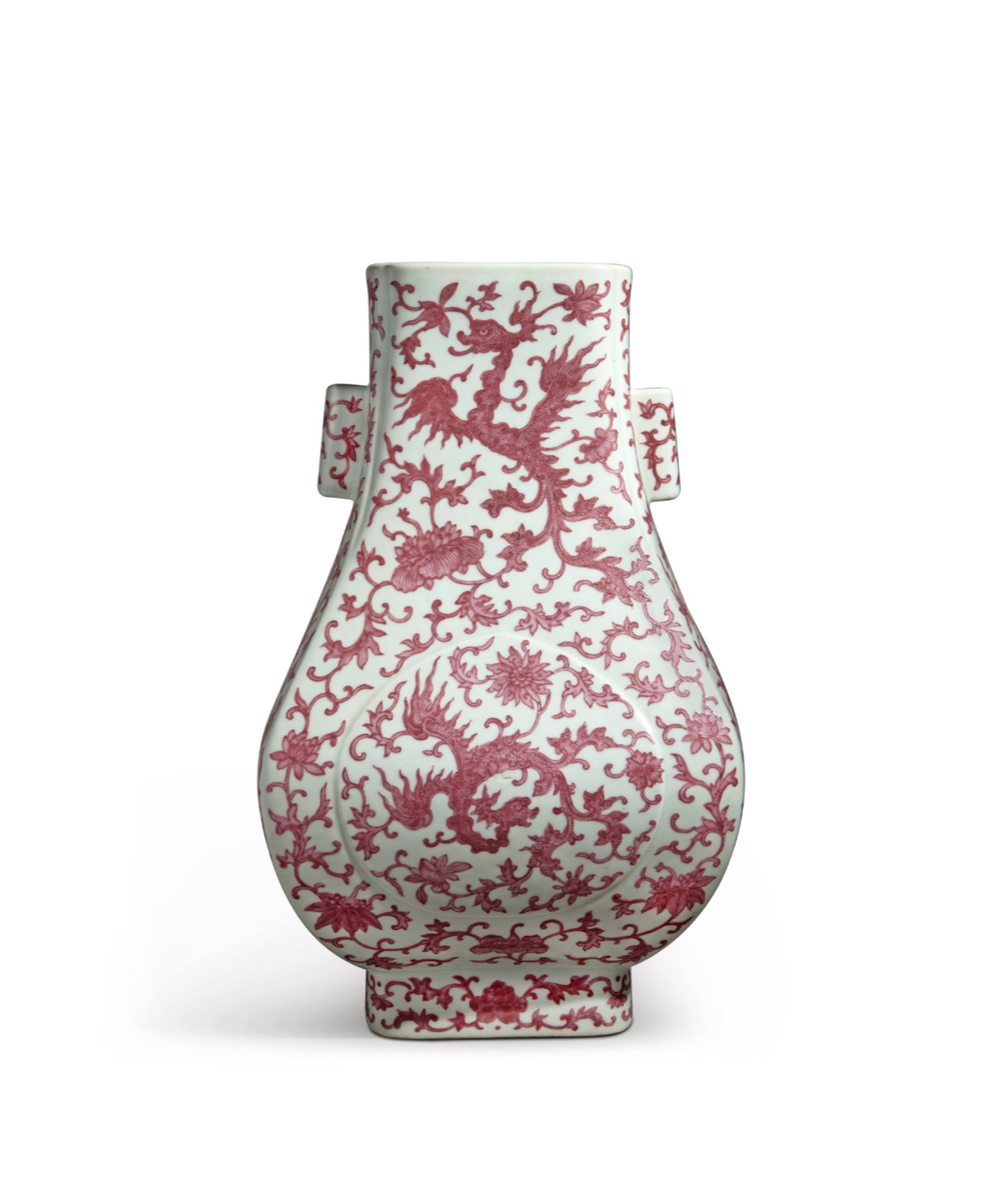 清道光胭脂红彩凤凰花卉纹大贯耳方壶