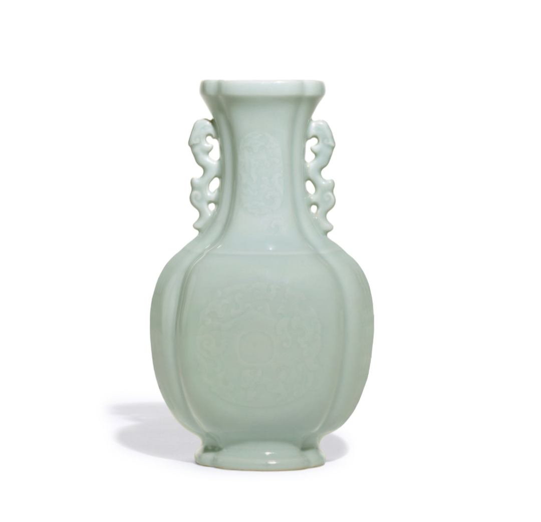 清乾隆粉青釉仿古龙璧纹夔龙耳海棠式瓶