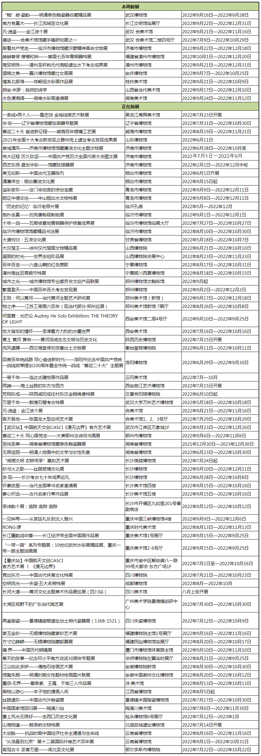 此次展览精选了漳州市博物馆馆藏185件/套(实际文物数量191件)珍贵海外银币、侨批、漳州窑瓷器等文物展品进行展览,计划展期2个月。展览时间:2022年8月18日—2022年10月15日本展览汇集了2021年评选出的中国百年百大考古发现的各个项目,共展出各类文物800余件(套),其中一级文物115件(套)。湖北省入选的六大项目遴选文物30余件(套)参展,包括屈家岭遗址的鼎、簋、盘、曲腹杯等典型屈家岭文化陶器,石家河遗址的人像、虎、蝉等石家河文化玉器,盘龙城遗址的簋、提梁卣等商代铜器,铜绿山遗址的春秋斧、锛、镢等铜制工具和孔雀石、赤铁矿、黄铁矿、铜蓝、云母等矿石标本,曾侯世代墓葬的西周曾侯簋、冉鼎、方鼎、鬲及玉佩,睡虎地秦墓的凤形勺、猪形盒等漆器,参展的文物来自湖北省博物馆、随州市博物馆、黄石市博物馆等收藏单位。展览时间:2022年9月2日—2022年12月2日展出王刚2000年以来创作的架上绘画、雕塑、行为、装置以及大地艺术作品,以系统、多维视角呈现了艺术家对黄河的精神之思,对黄河滋养的这片土地上人的命运与生存状态的关注,以及对整个人类文明的叩问。展览时间:2022年9月17日—2022年12月18日展览地点:郑州美术馆(新馆),第一、二、三、四展厅