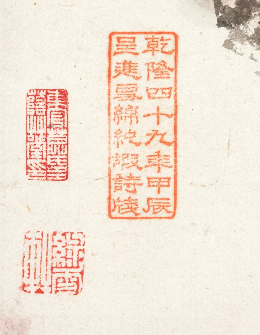 〈青山晋寿图〉左下方具「乾隆四十九年甲辰呈进雪绵纯嘏诗笺」印。「纯嘏」语出〈诗经〉,意为大福,以介眉寿,知该笺纸乃为恭庆乾隆七十三周岁寿诞进献之贡纸,当颇不易得,取此古纸作画,足见重视之切。