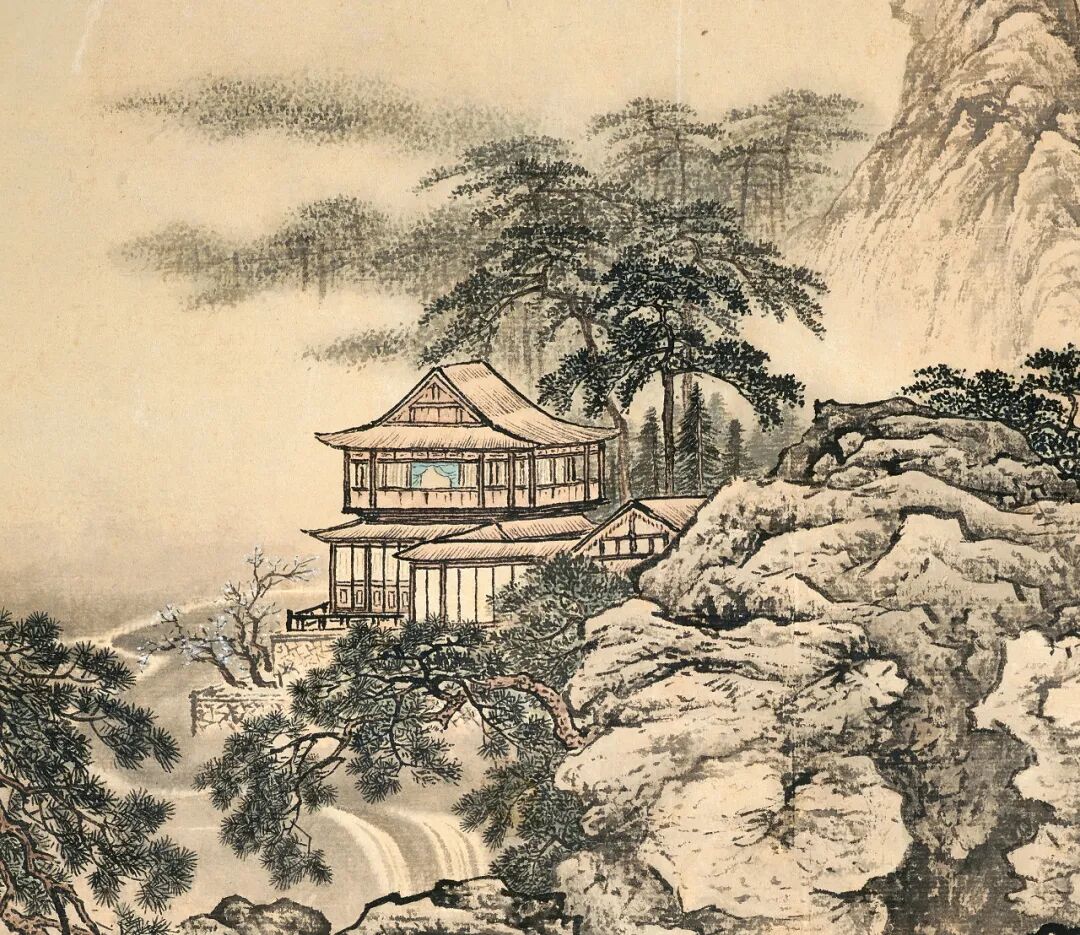 〈仿郭河阳山水〉崇峦峻岭,林木荫翳,楼阁错落布列,飞瀑高悬,下缀行旅渡者,得北方山水之丘壑雄奇、结构精严,然未亦步亦趋忠实对临原作,布局大致作镜像处理,排列更紧凑,愈显工谨整饬。