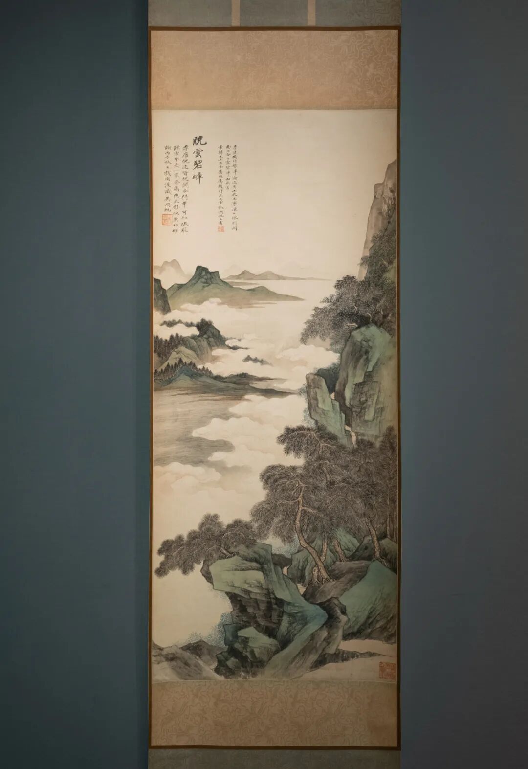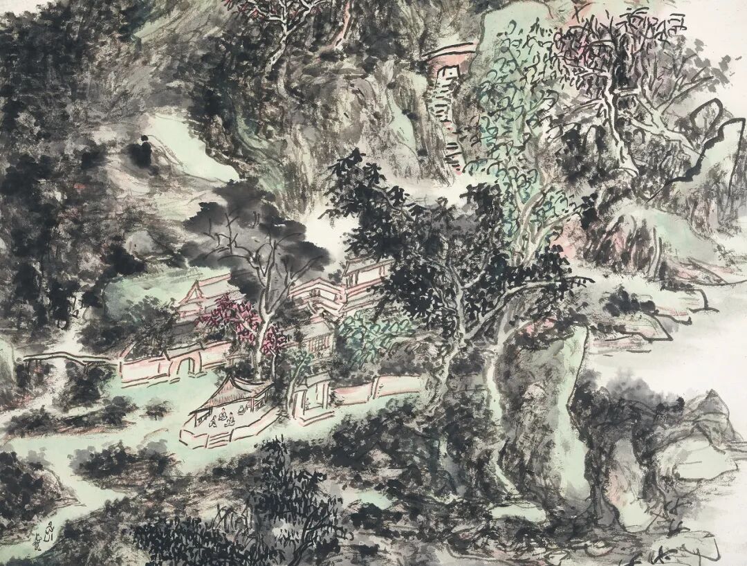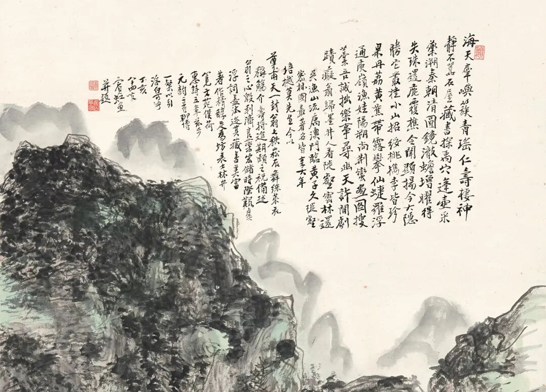 〈晓云碧嶂〉将李唐、倪瓒共冶一炉,既有北派山水之整饬,又具倪瓒之逸气,笔墨精谨,敷以沉净的石青、石绿,呈现雅腴灵秀之面貌。压角钤「待五百年后人论定」,自得与自信兼具!