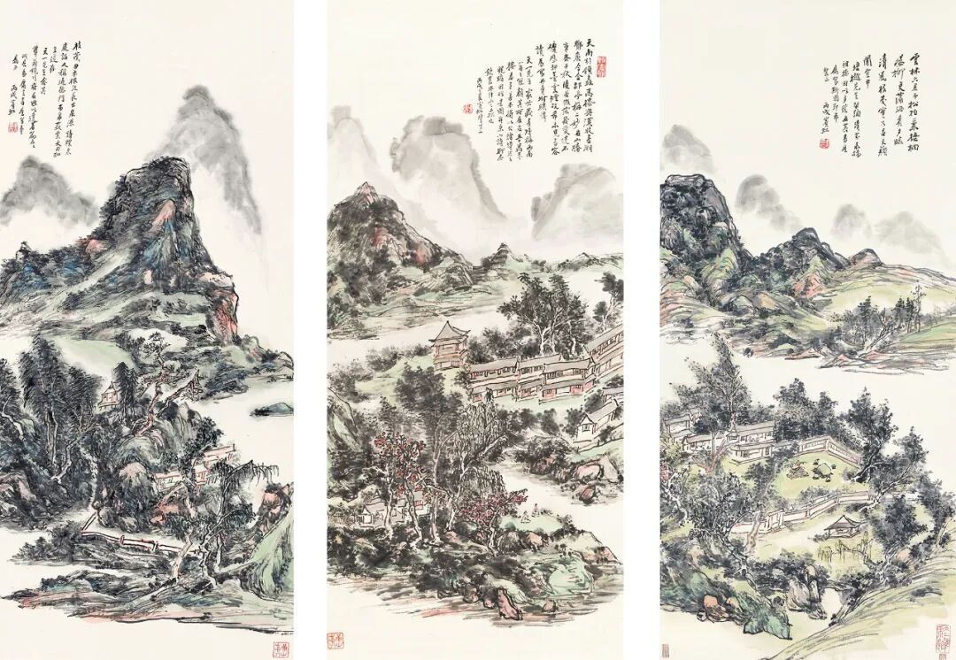 〈青山晋寿图〉尺幅宽于三幅藏书楼图,布局亦更饱满,山势自底部即起,巍峨耸峙,丰碑式构图,如同北宋山水,正是宾翁所景行致力者。皴笔稠密,尽求沉着,墨采反复加染,杂以石绿、赭红,既塑造丘壑遒劲浑厚之体量,又得青山蓊郁之风光。亭台上,三高士围谈,不远处尚见行者,或正为祝嘏赶来。画上缀七律二首,长题洋洋洒洒,笔力如锥画沙,与山势之磅礴映衬,内容呼应「晋寿」之主题,「仁寿」、「藏书」、「采药」及岭南诸胜等语辞,喻莫氏生平及郡望,末以吴历与黄公望〈陡壑密林图〉之典故作结。黄宾虹用此典,既因吴历与莫氏居澳门之共同经历,又因〈陡〉之篆籀用笔,皴法致密,与本幅尤有相通处。所题七律乃步莫氏韵,虽其原诗不存,证二人已直接互动,尚有其他诗文往来亦未可知。一九四七年,黄宾虹致族侄信中称:「鄙人只择人而与,非经至交介绍不动一笔……意留传精作,不与人争名利耳。」故以素未谋面之神交,赠佳作如此,实属不易。