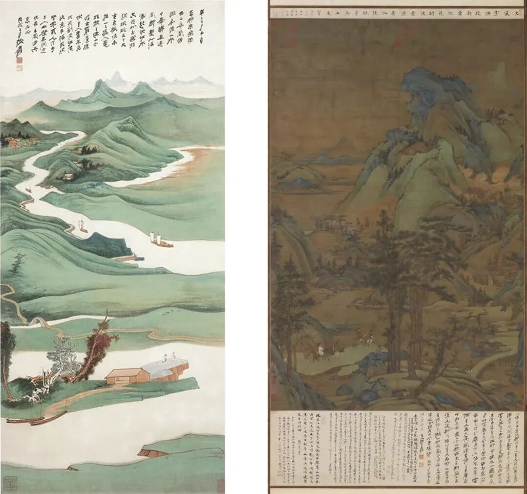 (左) 张大千一九四六年作〈嘉陵山水〉、(右) 大风堂旧藏董源〈江堤晚景〉