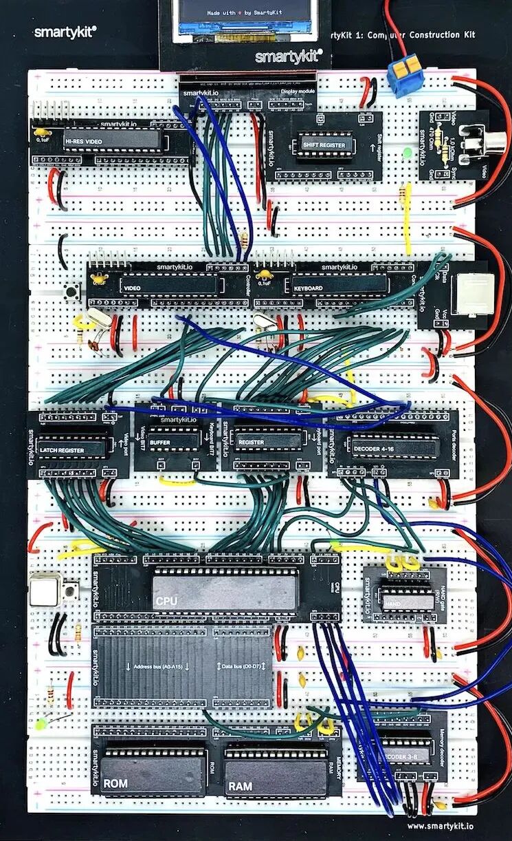 这款包含集成芯片、插拔式电缆以及各种电子元件(包括电阻、电容和二极管等等)外加面包板的套装组件,提供了一整套实用的 DIY 解决方案,不仅可以正常运行半个世纪前的 Apple I 原始代码,搭建的操作步骤也要比想象中更简单:不需要烙铁焊接,熟悉乐高科技组的用户很快就能掌握要领。