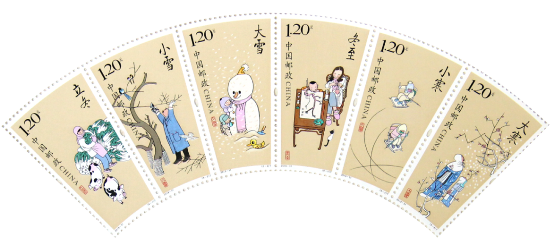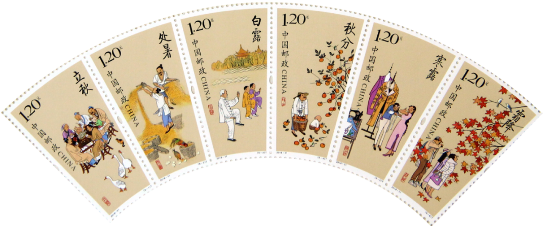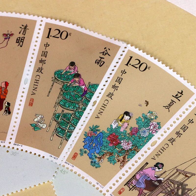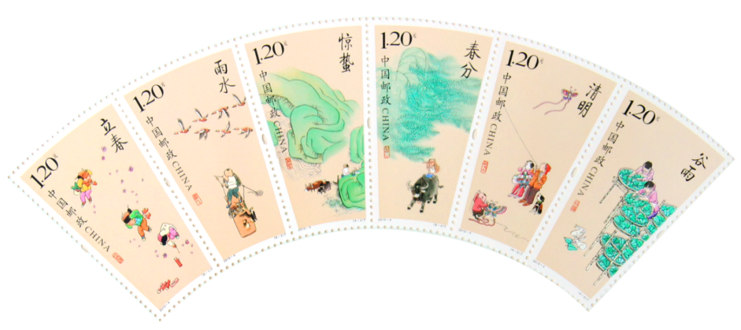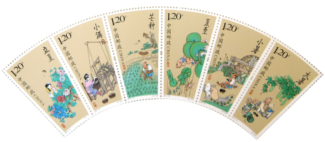 与纪念币相比,邮票则更早的选用了节气题材。2015年,中国邮政就开始把节气搬上邮票了。