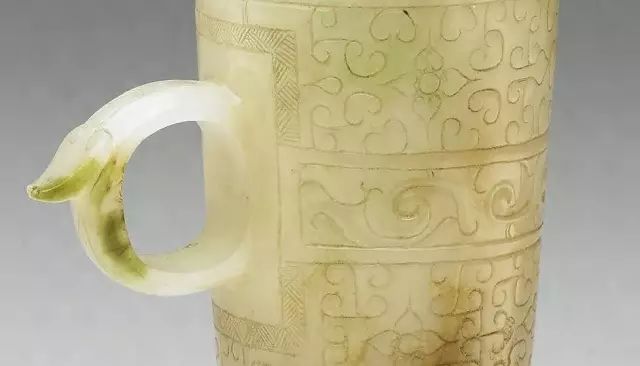 这件美丽秀雅的玉杯,是以莹润半透明的青白色玉雕成。杯体略呈细长的圆锥体,有高足与单柄。自口缘至高足上,以五条横饰带围绕器表,饰带中浅浮雕各式云纹、四瓣叶纹。口缘处、柄之外侧、高足至器腹下端,都因接触铜锈而沁成蓝绿色。其中以口缘处的沁色较为偏蓝,这或是因所接触的铜器,是用蓝铜矿中提炼出铜来铸造之故。古人相信美玉富含「精气」,更相信物质会产生感应作用。汉代的贵族特别重视玉制的容器,他们希望玉的精气能渗入所盛装的水或酒中,令饮者能成仙得道。﹝史记汉武帝本纪﹞记载,元鼎二年(公元前一一五年)时,汉武帝曾以铜盘玉杯承接露水,用以调和玉屑服食。近年来,曾于广州南越王墓曾出土成套的铜盘玉杯,应即是﹝史记﹞所记载,夜间承接露水之物。若与南越王墓出土的玉杯相比,故宫博物院的玉杯多了一个造形似英文字母a的单柄,这种单柄也常见于汉代的玉卮之上。