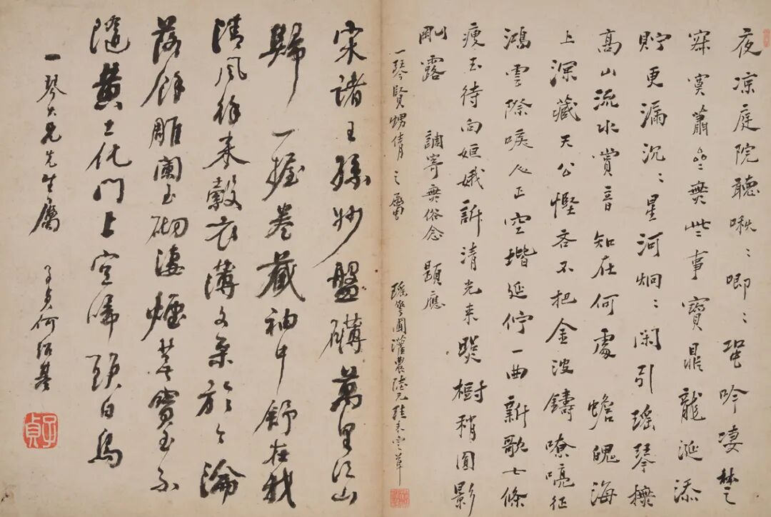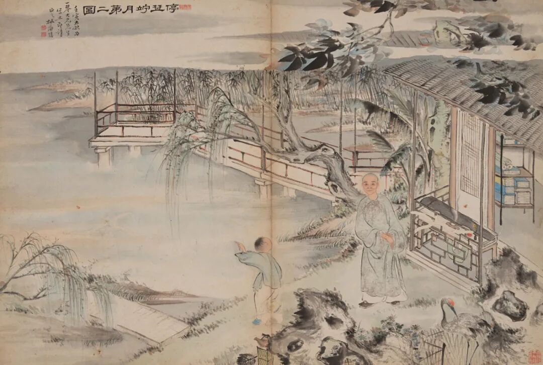 从册页目前装裱顺次翻阅,我们首先见阮元题扉曰:“停琴伫月第一图”,再见枫芗绘“停琴伫月第二图”,第三开为顾杰序文。而三开的完成时间分别为1842年、1842年和1833年。这不禁令观者产生疑问。再从画板题签条隐约可见“□戴合绘”等字,此与顾杰序文首句提到:“醇士为国儒自可几焉”可大胆猜测,此册页原来应有戴熙所绘“停琴伫月第一图”,绘制早于或正为1833年。多年后受赠者夏一琴请阮元题扉,并再请枫芗绘第二图。因此,可以理解为,此册首次装裱后有遗散,后经重新装裱才形成如此顺序。册页翻阅顺序与时间不符的还有夏之时在1840年在册页末尾所题呈“吟台诸大雅教正”的篆书行文。
