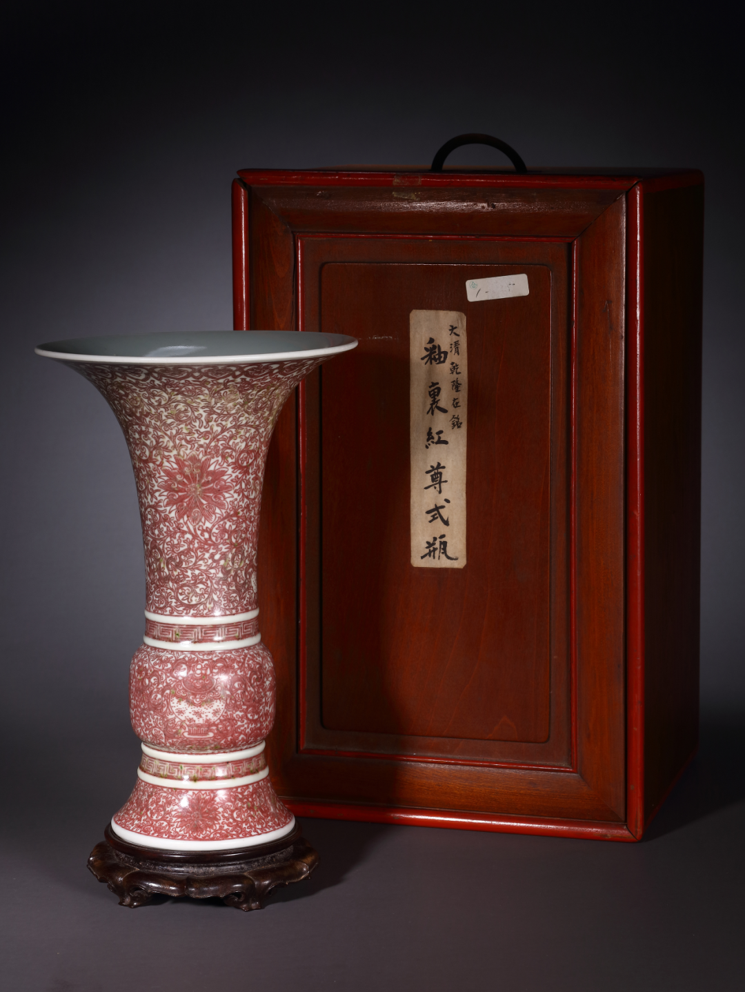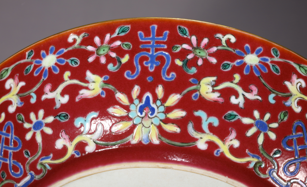 清乾隆 胭脂红地粉彩盘2.北京保利,2014年6月6日,Lot8267,成交价:RMB 207,000清光绪-宣统 庆亲王旧藏御赐御笔云龙地福寿大斗方一对清道光 粉彩雕瓷莲花、白菜烟壶 ,象生瓷豆荚、花生烟壶,青花爆竹烟壶一盒六件2.北京保利,2014年6月6日,Lot8312,成交价:RMB 109,250