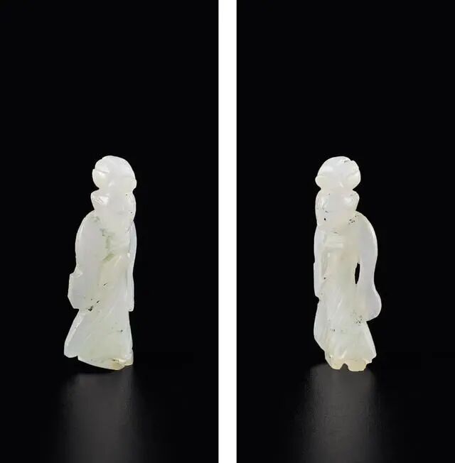 拍品白玉圆雕而成,玉质细腻温润。仕女梳高云鬓,神态安然,衣着长袖长裙,似随风摆动,风姿绰约,线条刻画简练而有力,形简意骇,极赋艺术感染力。此件玉器人物衣着古朴浪漫,十分难得可贵。
