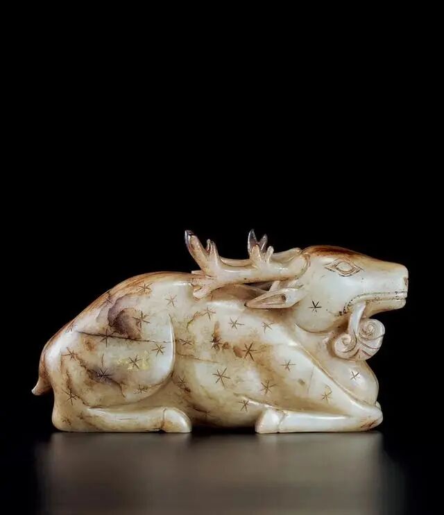 拍品取整块白玉籽料随形雕琢,玉质温润细腻,包浆浑厚,局部有褐色沁,温润古雅。圆雕卧鹿,鹿首朝前,眼睛用浅阴线刻画呈菱形,鼻用点眼工艺雕琢,闭口,唇部画一阴线,双耳外翻,灵芝形角贴于背部,神情温和,四足收于腹下,后足肱腱明显健硕有力,拱背,上饰短阴线,尾短巧,姿态优美自然。鹿谐音「禄」,寓意祥和福禄。整体形体饱满,边缘润滑,工艺精良,造型古朴,寓意吉祥,乃不可多得之佳器。