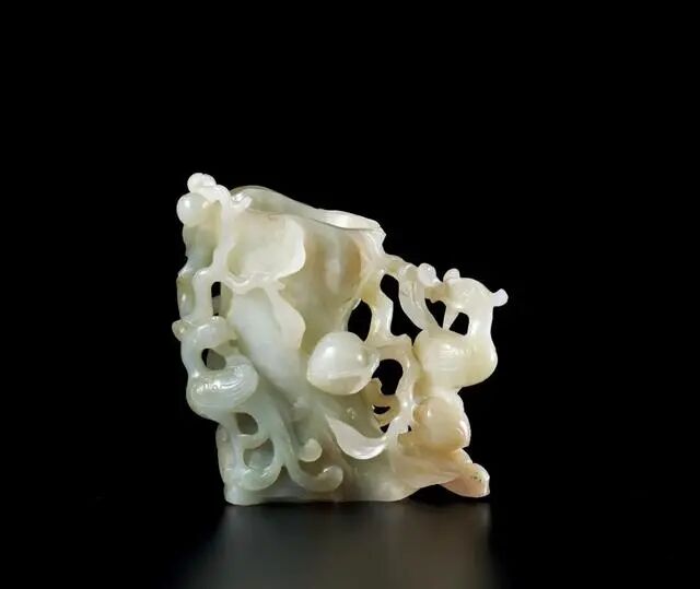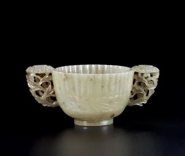 拍品玉质细腻温润,尺寸硕大,以整料掏挖雕制,不惜工料。玉杯造型精巧典雅,圆形花口,高立深壁,整器上部通体满雕菊瓣纹为饰,线条舒润明快,下方雕饰水草纹,线条波动连绵,别具意蕴,盏内部至外壁底部均琢菊瓣纹,线条舒润明快,杯心浮雕一朵五瓣形花朵,造型别致,外壁对称镂雕菊花纹杯耳,枝叶繁茂穿插,衬托中央饱满绽放花朵,十分具有立体感,极富装饰性。整器造型秀雅端庄,雕工精美绝伦,极富艺术感染力。