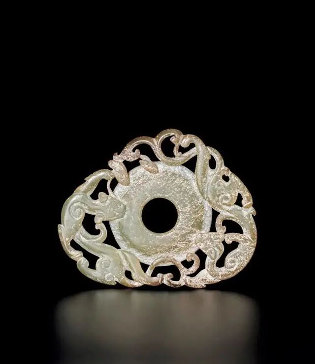 拍品青白玉雕就,玉质晶莹,沁色自然。包浆莹润。玉璧器呈椭圆形片状,镂雕双螭龙纹,姿态矫健,身姿婉转舒卷,颇具动感,首尾相逐于中央圆形玉璧上,中心开孔,打磨光洁,背面阴刻勾连云纹,刻画清晰,线条流畅,布局有序,寓意吉祥。整器雕工娴熟精湛,为典型元代特征。