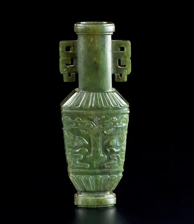 拍品由一整块璧玉精雕而成,玉质坚实细腻,玉瓶盘口,直颈,颈部对称镂雕夔龙耳,肩部雕饰菊瓣纹,腹部剔地雕饰兽面纹,双目圆凸,炯炯有神,不怒自威,纹饰章法严谨,古风盎然。此瓶造型大雅,端庄正气,刻工极具张力,线条流畅,纹饰精美造,为清代仿古佳作。