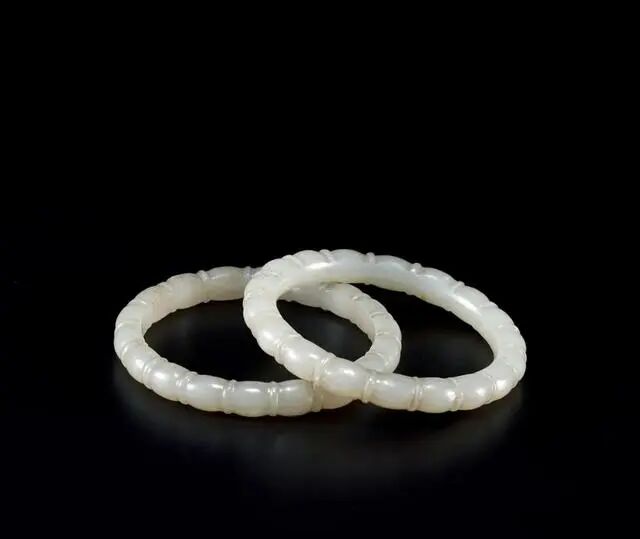 玉镯多圆形或椭圆形,藕节状者并不多见。此镯以整块和田玉籽料为材,造型相同。玉质温润细腻,手感上佳。通身雕藕节纹,每件皆有十八节。整器作工规矩,打磨精良。质地细腻温婉,线条圆滑,尤显高贵典雅之气质,也蕴含了中国传统文化意味,更兼有田园的烂漫野趣。