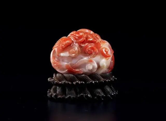 宋朝以降,宫廷收藏三代古铜均配以玉质盖钮,金元时期的游牧民族沿袭两宋传统,而毡帽之上亦带有玉顶。宣德一朝,焚香铜炉风行于世,因之世人将前朝器顶、帽顶等皆用为炉顶。拍品玛瑙质地,随形而雕,晶莹透润,红白相间,颜色对比鲜明,雕附螭龙攀爬,神态各异,四爪有力,身体弯曲呈“S”形,层次清晰,线条圆润,做工精美。炉顶造型古拙,雕工质朴,时代特征鲜明。