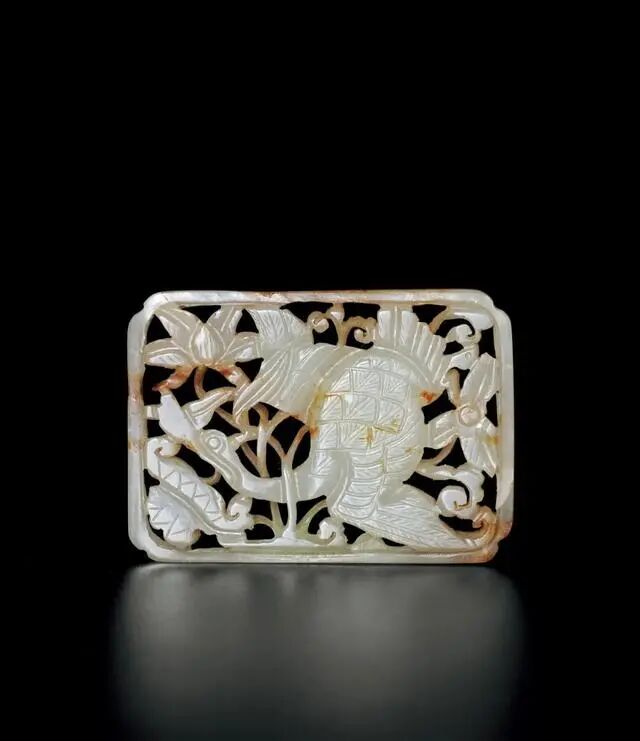 拍品呈长方形,玉质莹润细腻,透雕天鹅穿莲纹饰,天鹅展翅曲颈,身姿轻盈,莲池中荷叶舒展,或立或垂,花朵盛开,水草丰茂,极具生机。此类题材是以北方游牧民族渔猎生活为题材的玉雕作品,俗称“春水玉”,始于辽金时期,整器雕工朴拙,线条有力,时代特征鲜明。