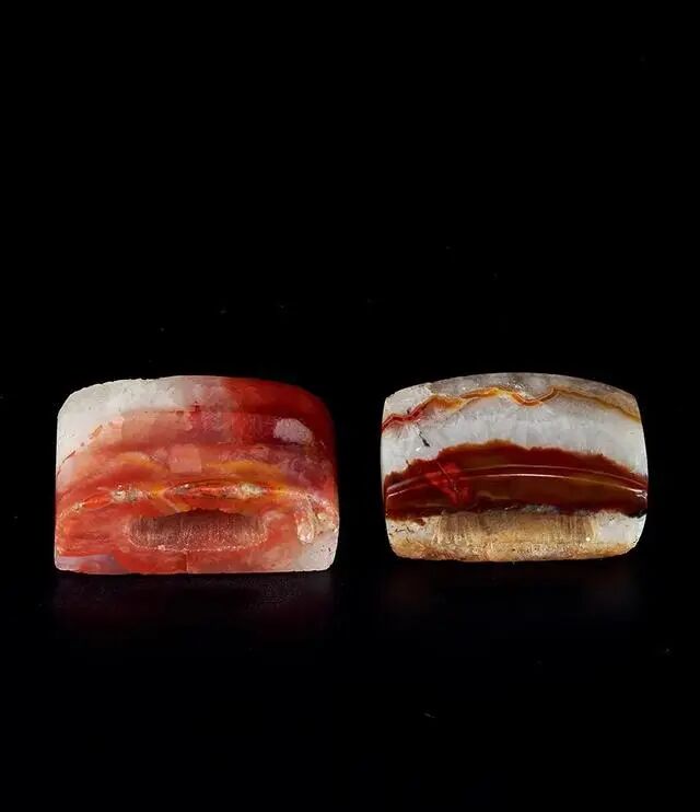 两枚剑璏为红玛瑙质地,质料莹泽细密,典雅秀丽,别致脱俗。皆为方形,形制较短,一只器身通体光素,无雕琢纹样,一只正面雕作曲波纹状,起伏柔美,背面无纹,下部矩形开孔,造型简洁明快,纹理自然交错,流光溢彩,精美瑰丽,充分展现玛瑙色彩斑斓、晶莹剔透之特性。整器气韵古朴,形制简练而韵味无穷。