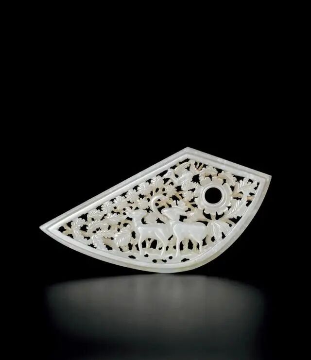带板白玉质地,玉质晶莹润泽,呈不规则扇形状。通体采用镂雕技法,两只鹿漫步于山林之间,一只抬首仰望,另一只回首张望,下踞多孔湖石,林间枝叶交错,花枝锦簇,仙鹤展翅飞翔其间,寓意“鹤鹿同春”,山林野趣,意趣横生。整器雕工娴熟,刻画生动写实,层次分明,颇具立体效果。