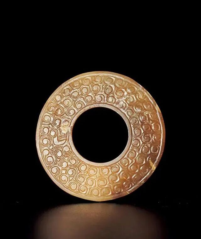 玉璧黄玉材质雕琢,玉质温润而带有局部灰沁。整体双面工雕琢,环内外缘各有一周阴刻线,形成内外边廓其后浮雕作谷纹并排列成行,错位相对。谷纹象征丰收与财富,古时贵族在一些重要礼仪场合要佩戴谷纹玉器以彰显地位。此件玉璧古拙大气、风格粗犷有力。