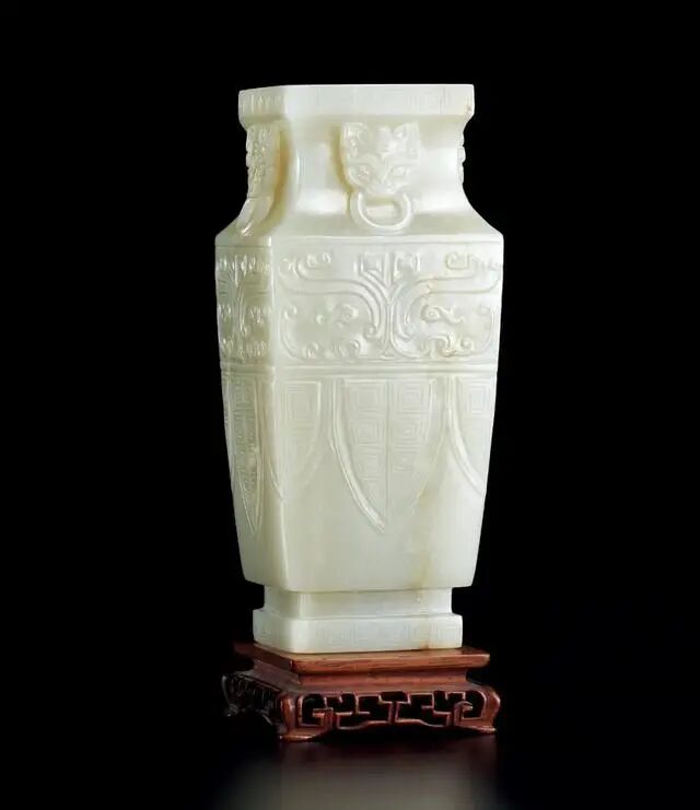 拍品选料纯正精良,以大块青白玉料掏膛雕制而成,通体纯净润白,色泽统一,玉质温润细腻,莹泽光亮。瓶体呈四方形,口部及足端皆雕饰一周回纹,线条清晰流畅,瓶身束颈,瓶颈四面雕饰铺首衔环耳,铺首双目炯炯,气势不凡,瓶肩方正,器腹由上至下逐步内收,四面均雕饰兽面纹,兽目圆睁,气势威严,下饰蕉叶纹,刻画细腻,疏密有致。整器用料考究,造型古雅庄重,做工精细,所雕纹饰工整华美,布局谨严,讲究居中与对称,呈现雅丽高贵之气。