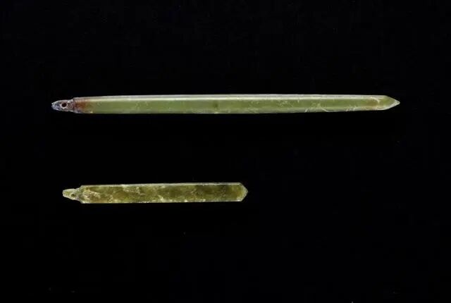 两件玉饰为青玉质地,致密温润。长短不一,周身均有灰沁。其一为四方形,一端开孔,另一件为圆柱形,造型质朴,打磨光洁。