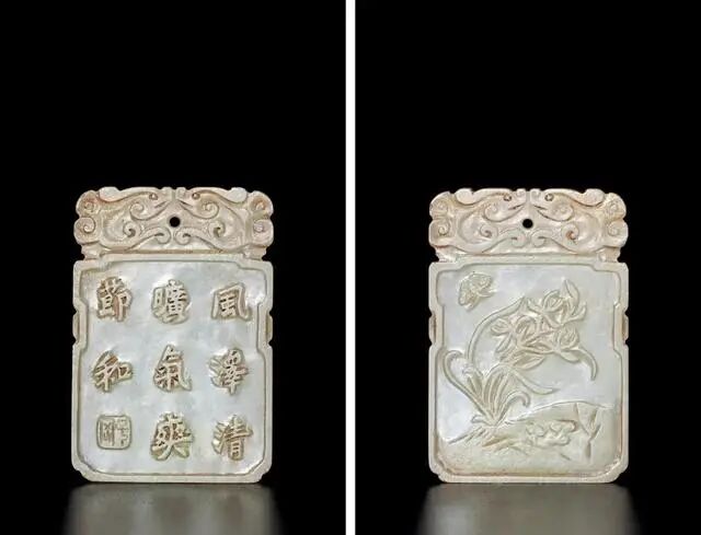 玉牌选料精良,取材厚实,细腻有泽,洁白莹润,予人柔美观感。作传统子冈式,长方形,倭角,牌首雕琢龙纹,正中穿孔,可供佩系。下方双面做方形开光,一面减地浅浮雕“芝兰献瑞图”,山石之上兰花风随风舞动,宛若凌波仙子,一棵灵芝破岩而出,寓意祥瑞,花香引来蝴蝶,一副清幽祥瑞之景,另面减地浅浮雕楷书诗文:“风泽清旷,气爽节和”,下落“子岗”款,字体端庄俊美,刻画工整有力。整器已经清幽,体现传统文人雅致审美情趣,或佩或藏,可谓与古雅之乐趣同游。
