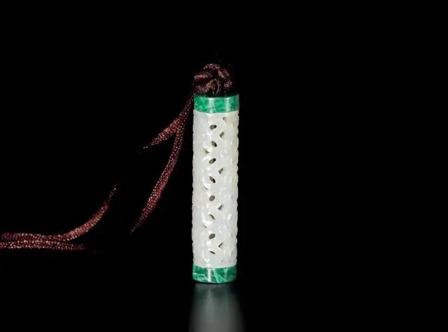 香囊白玉制,取料考究,玉质白润细腻。雕圆柱形,通体镂雕花卉纹饰,布局有秩,繁而不乱,兼具装饰与实用性,上下配以翡翠制盖和底,更显别致。整器用料上乘,琢制精湛,小巧玲珑,适宜随身佩带。