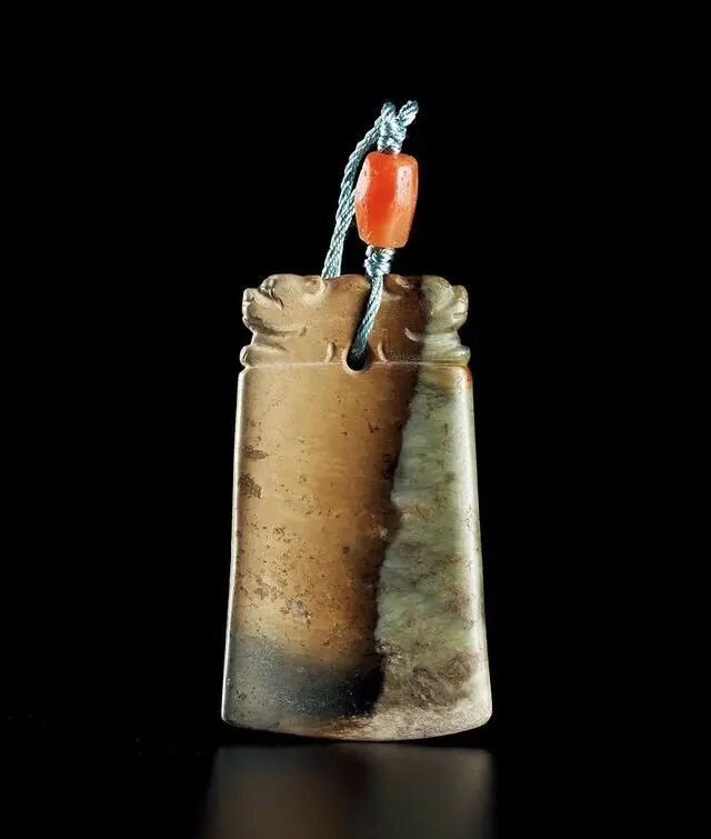 玉斧青玉制成,取料厚实,玉质凝纯细密,颜色变化丰富,巧做斧形。玉斧上端雕两只瑞兽背向而卧,神情威武,斧身呈梯形,光素无纹,打磨细致,线条简括流畅有力。整器刀法苍劲,古意盎然。