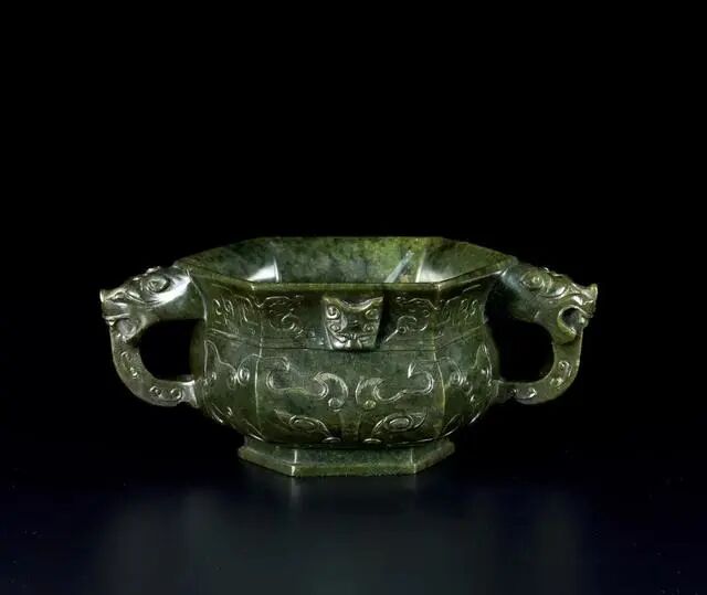 玉炉以碧玉精心雕琢而成。用料硕大,且质量上乘。炉作六方形,方口、颈部内收,鼓腹,下设六方高足。外壁以减地浅浮雕兽面纹,兽面鬃毛卷曲,横眉张吻,双目炯炯,威风凛凛,颈部高浮雕兽面纹,造型饱满,怒目圆睁,颇具威严,对侧雕兽吞耳,双目炯炯,高鼻阔口,露出锋利獠牙,颇具气势,内膛陶挖匀净,打磨光洁平整。整器造型考究,恢弘大气,工料俱佳,构图严谨,庄严肃穆,线条刚柔并济,游刃有致,雕刻技法多样,运用娴熟,刀锋细腻,勾勒自如,兽面之凛然威仪,纹饰之流畅精工,无不昭示了琢玉匠人制作之高超。