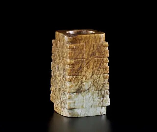 玉琮为青玉材质,光洁莹润,通体有黄褐色沁斑,变幻灵动自然,玉琮呈方柱形,内圆外方,四个平面中间琢有长条形凹槽,在纵槽两侧凹面上刻出等距的横向凹槽,相隔装饰横向弦纹,凸显立体感,每节又以竖槽为中轴,在相邻的两个凸面上对称琢刻圆形,形成兽面。整器造型庄重肃穆,纹饰刻画清晰流畅,刀工拙朴深邃,颇有古拙大雅之感。