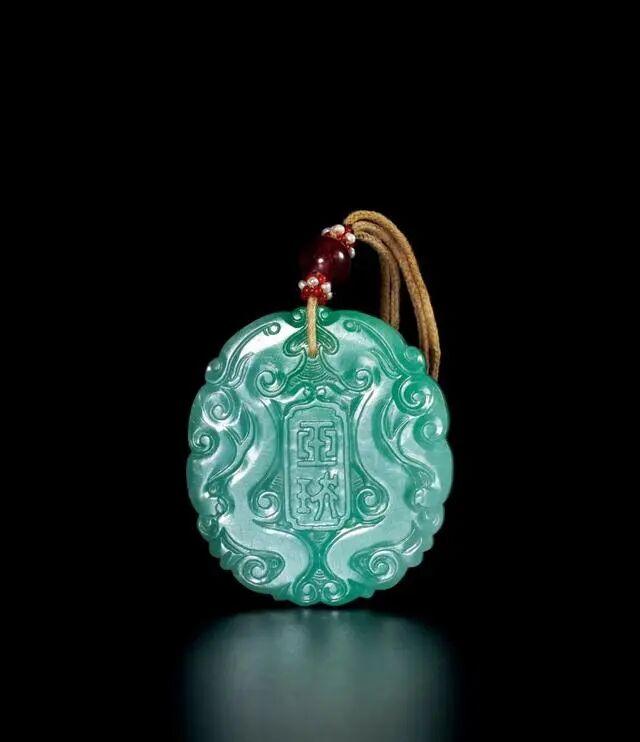 拍品翡翠质地,种水通透清澈,色泽饱满浓郁。雕作圆形,双面均阴刻双龙纹,龙形体态矫健,婉转灵动,中心开窗,以减地浅浮雕篆书“紫云”,另面为“玉”,布局有秩。整器做工精湛,用料考究,纹饰精美,另有旧配碧玺顶珠,保存状况优良,极为难得。