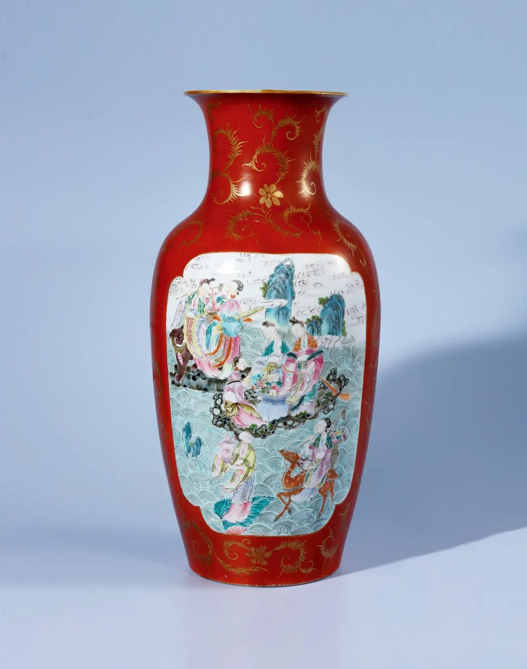 清乾隆 珊瑚红地粉彩开光群仙贺寿图瓶